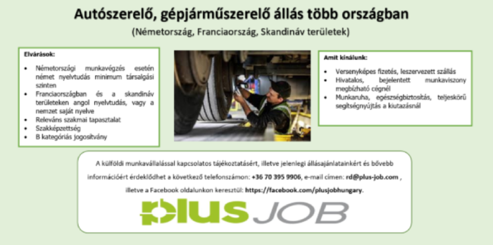 event 2017-04-27 | candidate@plus-job.com Autószerelő, gépjárműszerelő állás több országban euro_symbol Rugalmas 11 eurótól language jo