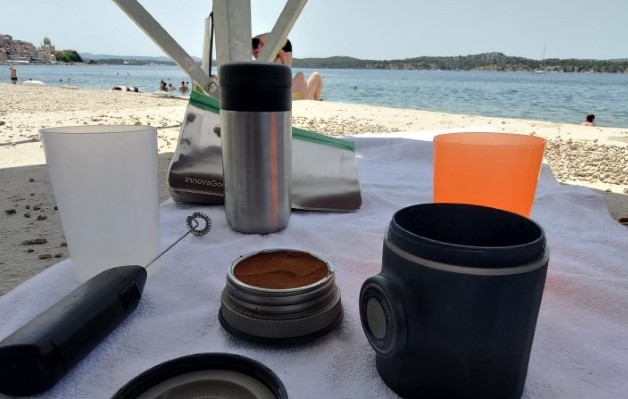 Kipróbáltunk egy hordozható kávéfőzőt és a repülőn és a parton is főztünk vele.