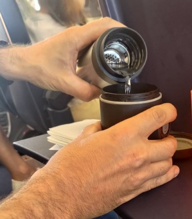 Azzal nem mondok nagy újdonságot, hogy a kávéfőzéshez 92-95 fokos vízre van szükség. Ez a gép viszont nem elektromos. A vizet vinni kell hozzá termoszban. Szintén a Wacaco-tól vettük meg erre a célra a Nanovessel nevű kis termoszt ami remekül végzi a dolgát és nem foglal sok helyet.